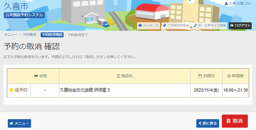 予約の取消が完了しました。「メニュー」ボタンを押して下さい。